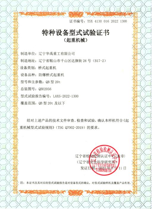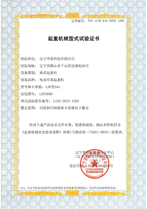 LDP電動(dòng)單梁型式試驗(yàn)合格證